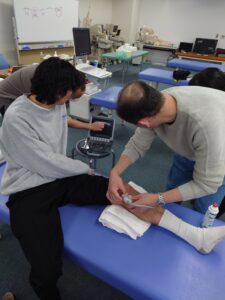 機器を使用して観察できる症例を部位ごとに紹介いただき、講師のデモンストレーションを見た後に、受講者同士で描出を行いました。